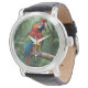Diese wunderschöne Uhr zeigt einen bunten Ara Papagei in einem zauberhaften Dschungel.