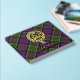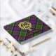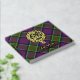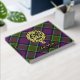 Clan MacDonald von Clanranald Wappen Abzeichen umgeben von einem Gurt und Schnalle über Tartan Hintergrund. Benutzerdefinierter Vorder-, Rücken- und Rückentext.