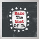 Das fette Textlesen "Make The Most Of It" zentriert sich auf einem grauen Hintergrund. Der schwarze Text sitzt auf einem weißen Rechteck mit großen, texturierten weißen Punkten um ihn herum, was einen spielerischen Kontrast zu der soliden Hintergrund der Farbe bietet.