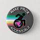 Beschreibung: Ein Button, das das aktive Rollstuhl-/Behindertensymbol darstellt, das sich vorwärts bewegt und die Streifen der Strichflagge für Behinderte hinter sich lässt und umreißt. Das Rad des Stuhls hat in der Mitte ein rosa Dreieck mit weißen Bewegungslinien. "Stolz zugänglich machen" steht oben und unten in weißem Text mit schwarzer Kontur.