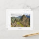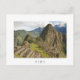 Postkarte der Ruinen der antiken Inkastadt Machu Picchu im Sacred Urubamba Tal bei Cusco in Peru mit weißer Grenze und Text: 'Peru'.