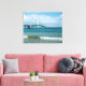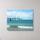 Friedlicher Nachmittag in Up North Michigan mit Blick auf die Mackinac-Brücke über die Halbinsel, während ein dunkler Frachter unter sich treibt. An der Küste stürzen sich anstehende Wellen. Dies ist die Art von Tag, der geschätzt wird!