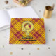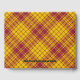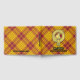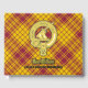 Clan MacMillan Wappen Abzeichen umgeben von einem Gurt und Schnallen über Kleid Tartan Hintergrund. Benutzerdefinierter Vorder-, Rücken- und Rückentext.
