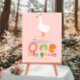 Dieses niedliche und skurrile Mädchen 1. Geburtstag Willkommensschild Design verfügt über eine alberne Gans mit einem rosa Party Hut und kann mit dem Namen Ihres Kindes personalisiert werden in niedlicher und farbenfroher Typografie. Das perfekte Bauerndesign für den ersten Geburtstag Ihres Kleinen!