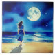 Keramik Kachel in einer Illustration einer einsamen jungen Frau in einem blauen Kleid stehend am Rande eines Strandes, Blick auf den Vollmond reflektiert auf dem Ozean. Der ruhige Nachthimmel ist mit Sternen übersät.