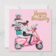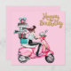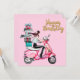 Ein Mädchen, das auf einem rosa Roller mit vielen Geschenken fährt.