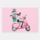 Ein Mädchen, das auf einem rosa Roller mit vielen Weihnachtsgeschenken fährt.