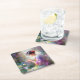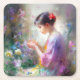Mädchen bewundert eine Blume in ihren Händen Rechteckiger Pappuntersetzer