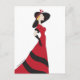 Mädchen in einem roten Kleid, schwarzer Hut und lange schwarze Handschuhe.