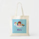 Eine Tasche mit einem niedlichen kleinen Mädchen in einem rosa gestreiften Badeanzug in einem eineisigen Schwimmbad, das helle und farbenfrohe Regenbogenmane, Schwanz, rosa Sterne und Horn hat. Personalisieren Sie Ihre Daten mit dem Namen des Kindes. Gut für den Sommer!