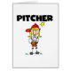 Ein Strichmännchenmädchen-Baseballspieler mit dem blonden Haar und eine rote Baseballuniform auf Baseball entwerfen T - Shirts, Tassen, Taschentaschen, Karten und mehr, die "Krug" lesen.