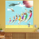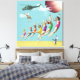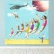 Moderne Collage Wall Art. Das ist Vintage Retro-Sprünge an den Badeschönheiten am Strand mit springender Katze, Hubschrauber, der eine Giraffe mit einem blauen Himmel nennt. Orangenfarben, Rosa, Gelb, Rot, lila, Weich Blau und Grün. Spaß, Mod und eklektische Ephemonie. Dies ist eine flache Oberfläche mit einer glatten Leinwand. Spaß, surreale Kunst mit einer Mischung aus Collage und digitaler Kunst, mit einem Vintagen Retro-Gefühl Mitte des Jahrhunderts.
