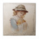 Eine Vintage Illustration über Geschenke und Bekleidung, in der ein junges Mädchen einen Hut mit zart Blume trägt und mit ihrer Schürze eine Armlehne voller Babyentlings knackt.