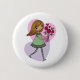 Süße Mini-Kunst einer fantasievollen Mädchenfigur mit langem, fließendem gelben Haar und einem grünen Kleid und gestreiften Strümpfen. Sie hält einen schönen Strauß roter Rosen in ihren ausgestreckten Händen. Ursprünglich als digitale Kunst erstellt, ist dies ein entzückendes Kunstwerk, ideal zum Dekorieren Ihres Jackets oder Ihrer Tasche.