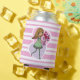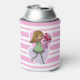 Süße rosa und weiße gestreifte Dosenkühler mit einem fantasievollen Mädchen mit langem, fließendem gelben Haar und einem grünen Kleid und gestreiften Strümpfen. Sie hält einen wunderschönen Strauß roter Rosen in ihren ausgestreckten Armen. Der Hintergrund besteht aus einem rosa und violetten Liebesherz.