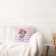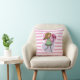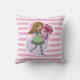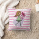 Hübsches rosa und weiß gestreiftes Kissen mit einem skurrilen Mädchen mit langem, fließendem gelben Haar, das ein grünes Kleid und gestreifte Strümpfe trägt. Sie hält einen schönen Strauß roter Rosen in ihren ausgestreckten Armen. Der Hintergrund besteht aus einem rosa und violetten Liebesherz.