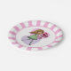 Lustige rosa und weiße Party-Teller mit einem süßen, verspielten Mädchen mit langen, fließenden gelben Haaren, das ein grünes Kleid und gestreifte Strümpfe trägt. Sie hält einen wunderschönen Strauß roter Rosen in ihren ausgestreckten Armen. Der Hintergrund besteht aus einem rosa und violetten Liebesherz.