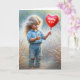 Niedliches kleines Mädchen mit Denim rippte blaue Jeans und hielt einen roten Herzballon auf einem Landfeld, um an dich zu denken. Alle Texte können geändert werden.