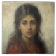 Dieses Design zeigt ein Gemälde des russischen Künstlers Alexejewitsch Harlamoff (1840-1925). Es zeigt eine schöne junge Frau mit dunkelbraunem Haar und vollen roten Lippen. Sie trägt einen roten Schal, und sie starrt wehmütig in die Mitte. Es ist ein Bild weiblicher Schönheit.