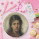 Dieses Design zeigt ein Gemälde des russischen Künstlers Alexejewitsch Harlamoff (1840-1925). Es zeigt eine schöne junge Frau mit dunkelbraunem Haar und vollen roten Lippen. Sie trägt einen roten Schal, und sie starrt wehmütig in die Mitte. Es ist ein Bild weiblicher Schönheit.