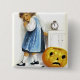 Vintage Halloween-Illustration, die ein Mädchen und Jack in Lantern zeigt, mit der Aufschrift "Bücher und Hexen sind zu Abend beschäftigt, um gute Kinder zu ficken; lasst uns zusammenkommen, um den Charme abzuwehren, zu lachen und fröhlich zu sein, und alle Wecker vergessen."