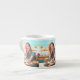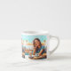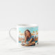 Lächelndes Mädchen mit einer entspannenden Kaffeepause, Cappuccino. Künstlerisches Image für einen erholsamen und unterhaltsamen Aufenthalt mit sonniger Meereskulisse.