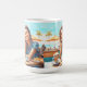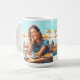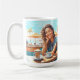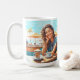 Lächelndes Mädchen mit einer entspannenden Kaffeepause, Cappuccino. Künstlerisches Image für einen erholsamen und unterhaltsamen Aufenthalt mit sonniger Meereskulisse.