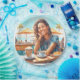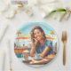 Lächelndes Mädchen mit einer entspannenden Kaffeepause, Cappuccino. Künstlerisches Image für einen erholsamen und unterhaltsamen Aufenthalt mit sonniger Meereskulisse.