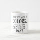 Mädchen mit Regenschirm in Wind Positive Quote Kaffee Tasse. Dieses zeichnend zeigt ein im Wind stehendes Mädchen, ihr Rücken kehrte zum Betrachter um. Sie hält einen Regenschirm. Das Haar des Mädchens wird im Wind geblasen. Der positive Text sagt "Trage deine Farben auch an den wolkigsten Tagen".