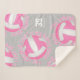 Das Volleyball-Thema der Sherpa-Fleecedecke zeigt 5 zufällig platzierte, rosa und weiße Volleybälle mit dem Text "Der Volleyballplatz ist mein glücklicher Ort" in Rosa, die jeden Volleyball in einem spielerischen typografischen Schriftart umkreisen, alles auf grauem Hintergrund - ihr Name und ihre Trikotnummer sind individuell einstellbar - von katz_d_zynes