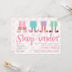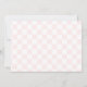 Eine Party Einladung zum Geburtstag, in der vier Stiefelpaare mit Flamingo-, Bär-, Katzen- und Hausschuhen dargestellt werden. Pajamas haben Pastellmuster. Hintergrund ist rosa Schachbrettmuster.