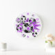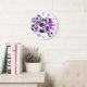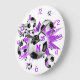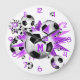 Die Wanduhr des niedlichen Mädchens im Fußball ist mit einer "Explosion" von Fußballbällen unterschiedlicher Größe und lila, rosa und weißen Sternen-Formen mit überlagerten Uhrenziffern versehen - personalisieren Sie das Monogramm und die Trikotnummer des Athleten - von katz_d_zynes
