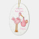 Eine entzückende ovale Keramikverzierung für die Ankunft des Babymädchens. Ausrüstungsbeschreibungsstorch, der rosa Babybündel trägt. Vervollkommnen Sie für Babypartygeschenk! Personifizieren Sie mit Text für Ihren besonderen Anlass.
