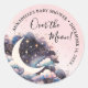 Trendy Wasserfarbe über dem Mond Baby Dusche Rundaufkleber. Mit diesem runden Aufkleber zum Himmelsthema fügen Sie Ihrer Babydusche eine zauberhafte Touch hinzu. Das Design zeichnet sich durch eine verträumte Aquarellfarbe Mitternachtshimmel aus, mit einem leuchtenden Mond, der unten links platziert ist, umgeben von funkelnden Sternen für einen skurrilen Effekt. Oben rechts wird die Phrase "Over the Moon" in eleganter Schrift-Typografie dargestellt. Rund um den Rand des Aufklebers können Sie mit dem Namen der Mutter-zu-sein und dem Veranstaltungsdatum für ein süßes, individuelles Detail personalisieren. Der Hintergrund ist mit einem sanften rosa Farbverlauf versehen, aber man kann ihn in Blau, neutral oder in einer beliebigen Palette umschalten, um dem Duschstil zu entsprechen. Dieser Aufkleber eignet sich ideal für Siegel, Umschlagsschließungen oder Dekorationen und verleiht der Feier eine charmante Touch.