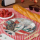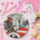 Dieses Design zeigt ein Gemälde der dänischen Künstlerin Gerda Wegener (1886-1940). Es zeigt eine modische Dame, die einen stilvollen Mantel trägt und in einem roten Sportwagen Fahrhandschuhe trägt. Neben ihr im Vintagen Automobil ist ein weißer Mops. Die Frau und ihr Haustierhund starren gerade nach vorn. Im Hintergrund stehen stilisierte Bäume, und auch ein Paar Pferdefahrer kommen vorbei. Das Kunstwerk ist im Art-Deko-Stil bemalt und wurde ursprünglich 1927 hergestellt.