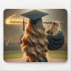 Ein junges Mädchen mit langem, gewelltem Haar, das eine Graduierungsmütze und ein Kleid trägt, hält sicher einen flammenden Baseballschläger in einem Stadion