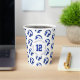Diese Volleyball-Geburtstagsparty-Tassen mit mehreren kleinen, stylisierten blau-weißen Volleybällen, die in einem einfachen Tropfenmuster angeordnet sind - Text auf einer weißen Kreissymbole kann angepasst werden, derzeit die Zahl 12, um ein Kindalter zu repräsentieren, das durch die Worte "Glücklicher Geburtstag" von katz_d_zynes umgeben ist