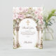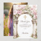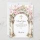 Fügen Sie auf der Rückseite ein Foto im Hochformat hinzu. Ein antiker Marmorbogen mit rosa Blumen und einem goldenen Kreuz . Personalisieren und fügen Sie einen Namen und eine Dankesnachricht hinzu.