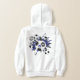 Der Fußball-Hoodie dieses sportlichen Mädchens zeichnet sich durch eine "Explosion" von Fußballbällen unterschiedlicher Größe und blauen, schwarz-weißen Sternen aus - ein winziges, weißes Polka-Punktmuster überdeckt den schwarzen Stern - passt sich mit Namen, Monogramm und Jersey-Nummer an - Design liegt auf der Rückseite des Hoodies, kann aber auf die Vorderseite verschoben oder kopiert werden - von katz_d_zynes