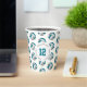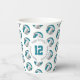 Diese Volleyball-Geburtstagsparty-Tassen sind mit mehreren kleinen aquamarinen, grauen und weißen Volleybällen ausgestattet, die in einem einfachen Tropfenmuster angeordnet sind - Text auf einer weißen Kreisgrafik kann angepasst werden, derzeit die Nummer 12, um das Alter eines Kindes zu repräsentieren, das von den Worten "Geburtstag glücklich" - von katz_d_zynes umgeben ist