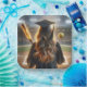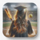 Eine junge Frau mit fließendem Haar, gekleidet in einem Abschluss mit Kappe und Kappe, steht auf einem Baseballfeld und hält einen flammenden Fledermaus mit einem Softball in der Nähe