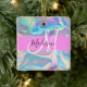 Girly pink, peach und aqua holografisch irisierenden Monogramm Name und erste Keramik Ornament. Individuelle Name und Monogramm sind in einem handgeschriebenen, eleganten Skript mit rosa Hintergrund geschrieben. Ein perfektes Geburtstag- oder Weihnachtsgeschenk!