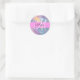 Girly pink, peach und aqua holografisch irisierenden Monogramm Name und erste klassische runde Aufkleber. Individuelle Name und Monogramm sind in einem handgeschriebenen, eleganten Skript mit rosa Hintergrund geschrieben. Ein perfektes Geburtstag- oder Weihnachtsgeschenk!