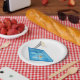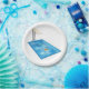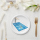 Ein Mädchen, das in einem Swimmingpool mit einem Tauchbrett schwimmt. Dieses Design sieht wirklich effektiv aus bei diesen Paper-Tellern