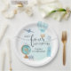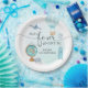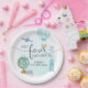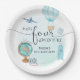 Made Four Adventure 4th Birthday Party Paper Plates design with blue hot air balloon, luggage, a globe, camera, passport and airplane. Adventure theme 4th birthday party.
