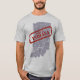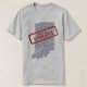Ein grunziges Grafikdesign einer Indiana-Landkarte und ein Gummieindruck mit dem Text "Made in Indiana" von Künstlerin/Designerin Charmaine Paulson auf einem männgrauen T - Shirt.