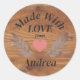 "Personalisiere" diesen klassischen Rundaufkleber mit "Made with Liebe from.." auf rustikalem Holzhintergrund und deinem Namen mit botanischem Kranz und rosa Mittelherz! Karo alle Optionen vor der Bestellung.