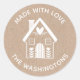 Ein Kraftpapier und ein weißer skandinavischer Weihnachtsaufkleber mit den Worten Made with Liebe. Personalisieren Sie es mit Ihrem Familiennamen. Spaß für die hausgemachten oder handgefertigten Weihnachtsnachbarn Leckereien und Geschenke, oder für Ihr Handwerk. Entworfen für Sie von BlackBerry Boulevard.