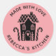 Ein personalisierter Aufkleber "made with Liebe" mit einem niedlichen kleinen Lebkuchenhaus mit Herz und Worten, mit Liebe auf einem rosa Hintergrund. Personalisieren Sie es, indem Sie Ihren eigenen Namen hinzufügen. Eine hübsche Touch für all Ihre hausgemachten Geschenke. Entworfen für Sie von BlackBerry Boulevard.