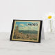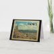 Madrid Spanien Design im Vintage Travel Stil mit einer Stadtansicht mit Bergen als Hintergrund.